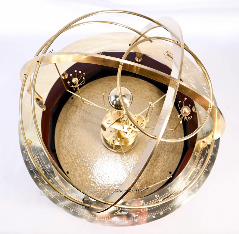 At the heart of our orrery models lies a powerful solid brass clockwork mechanism, calibrated to orchestrate the orbits of the planets in correct relative motion- in faithful ratio of each planet's orbit to one another. An orrery represents a model of the planetary movements in our solar system.The nine planets gracefully orbit an orange calcite sphere or solid brass Sun.